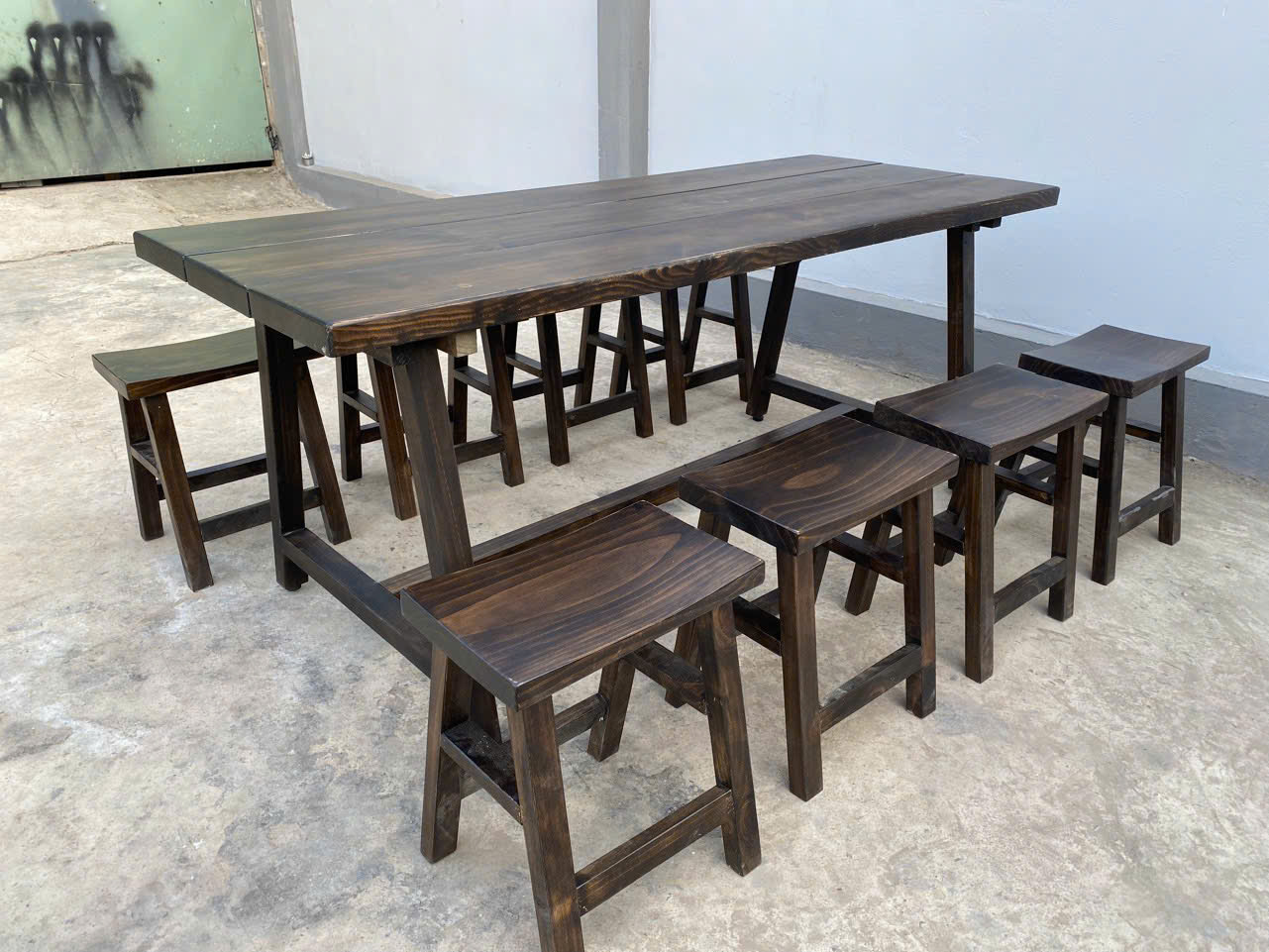 Bộ bàn gỗ thông dài 1m8, kết hợp 8 ghế đôn, phù hợp mô hình quán nhậu bình dân cần nhiều chỗ ngồi, xoay vòng khách nhanh. Thiết kế đơn giản, bền chắc, dễ bố trí trong không gian quán rộng hoặc ngoài trời có mái che.